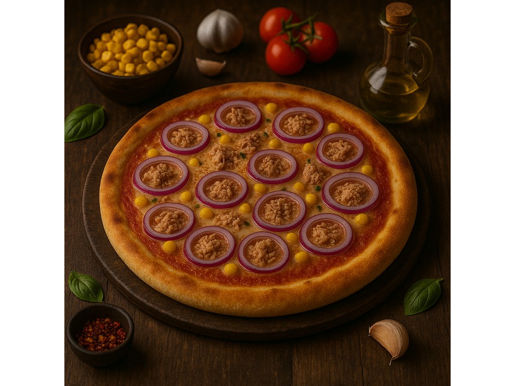 tomat, oregano,tuniak, cibuľa, kukurica, syr